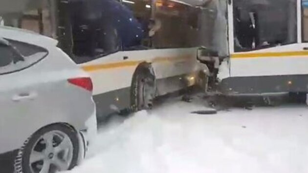 Два человека пострадали в результате столкновения на перекрестке двух рейсовых автобусов в подмосковной Ивантеевке, сообщает ТАСС со ссылкой на пресс-службу подмосковного главка МВД. "В 09:30 мск на пересечении улиц Первомайской и Дзержинского произошло столкновения двух рейсовых автобусов. ДТП, по предварительным данным, произошло в результате заноса на повороте одного из транспортных средств из-за скользкой дороги", – сказал представитель ведомства. Он пояснил, что информация о пострадавших пока уточняется. В свою очередь, источник в экстренных службах сообщил, что в результате ДТП пострадал водитель одного из автобусов и пассажир. В настоящий момент медики оказывают им помощь на месте происшествия. Он также уточнил, что детей среди пострадавших нет. У одного автобуса сильно повреждена передняя часть, а у второго разбито лобовое стекло. На месте ДТП затруднено движение автомобилей. Ранее ДТП с участием самосвала и военных автобусов произошло на Новорижском шоссе в Подмосковье. Водитель рассказал, что во время поездки стекло машины залепило грязью. Он попытался его отмыть и отвлекся от движения, из-за чего и врезался в колонну военных автобусов. В результате аварии погибли 4 человека, более 40 получили травмы.