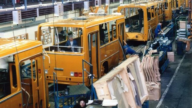 А так эти автобусы производились на заводе в Венгрии. На одном конвейере собираются сразу обе секции, одна за другой. Новенькие автобусы в характерном оранжевом цвете выглядят просто потрясающе!