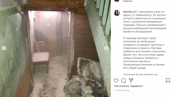 В Салехарде, где стоят морозы под минус 50 градусов по Цельсию, в доме по адресу ул. Маяковского, 58 обледенел подъезд. Об этом сообщил глава города Алексей Титовский в своём аккаунте в сети Instagram.