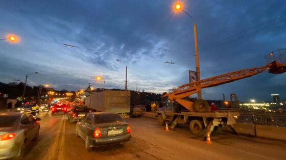 Напомним, происшествие на проспекте Стачки произошло вчера. КАМАЗ, двигавшийся в сторону проспекта Сиверса, зацепил автовышку, которая стояла в крайнем правом ряду. В этот момент в люльке автовышки находились двое рабочих, 26 и 28 лет. Они сорвались и упали на железнодорожные пути. Один человек погиб, второго госпитализировали.