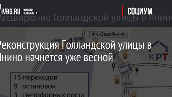 К расширению Голландской улицы в Янино приступят уже этой весной. Проект по реконструкции дороги уже согласован. Реконструкция предполагает расширение по всей длине дороги — 2,7 километра от Колтушского шоссе до Кинологического центра. Также установят девять остановок и три светофорных поста, обустроят 235 парковочных мест и 15 пешеходных переходов. Сами работы пройдут в два этапа: в этом году - часть дороги от Колтушского шоссе, в следующем - вторую половину дороги. Сейчас завершается оформление соглашений об инвестировании в строительно-монтажные работы с компаниями, строящими жилье в Янино-1. Расширение улицы начнется с началом весеннего сезона, как только позволит погода.