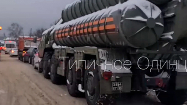 По словам очевидца, приславшего ролик, на кадрах зенитный ракетный комплекс С-400. В колонне, показанной на видео, шесть систем.