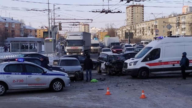 В Екатеринбурге днем 25 февраля на перекрестке улицы Ильича и проспекта Космонавтов на Уралмаше произошло массовое ДТП.