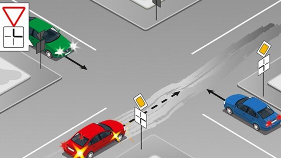К перекрестку подъехало три автомобиля: синий, зеленый и красный. Во время маневра, красный автомобиль понесло по скользкой дороге. Как можно скорее постарайтесь ответить на вопрос: “Должны ли зеленый и синий автомобиль пропустить красный?”.