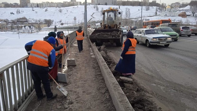 Дорожные рабочие и спецтехника чистят тротуары и прибордюрную полосу на мосту. Также ведутся работы на прилегающих к нему улицах.