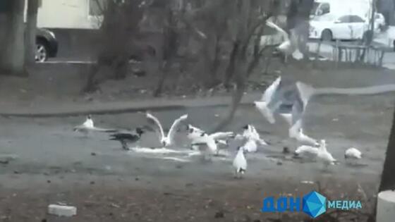 Ростовская область, 31 марта 2021. DON24.RU. Ссору чаек и вороны сняли на видео ростовчане. Черная птица позарилась на хлебные крошки, которые клевали незваные гости донской столицы и храбро разогнала чаек. Но последние взяли количеством, вороне пришлось уступить. Напомним, первые видео с жалобами на атаковавших ростовские дворы чаек, стали появляться в сети во второй декаде марта. Тогда горожане были обеспокоены появлением большого количества этих птиц Позже ростовчане рассказали о стае птиц, поселившейся во дворе дома на Стачки/Тружеников. Крылатые гостьи облюбовали местный мусорный контейнер и даже потеснили голубей-старожилов. Ученые предположили, что появление в городе птиц связано с плохой погодой — как только потеплеет и закончатся дожди, чайки отправятся дальше по пути своей сезонной миграции.