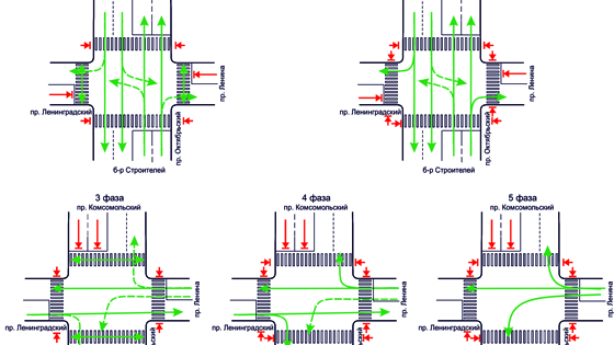 Для решения данной проблемы предложены два варианта. В первом будет полностью разделено встречное движение по Ленинградскому в разные фазы цикла светофора, однако это приведет к росту транспортных задержек.