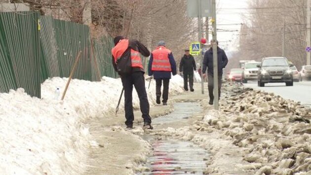 Между снежными комьями течет ручей. Он поможет побыстрее избавиться от осадков. Рабочие формируют русло, осколки складывают вдоль бордюров.