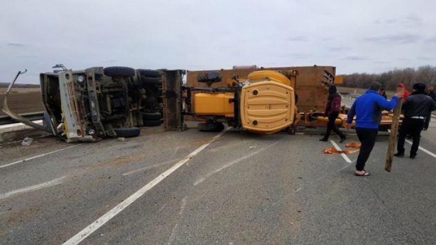 На трассе в Волгоградской области неисправный КамАЗ опрокинулся на дорогу