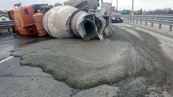 В результате ДТП произошел розлив бетоносмеси на проезжую часть.