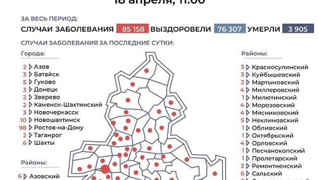 Ростовская область, 18 апреля 2021. DON24.RU. В 48 муниципалитетах Ростовской области зафиксированы новые случаи заболевания COVID-19, сообщает портал донского правительства. По городам картина складывается разная. Если в Ростове выявлено 98 зараженных, то в других крупных городах - значительно меньше. В Таганроге, втором по численности населения городе донского края, обнаружили двух инфицированных, в Шахтах (третий по численности город) - шестерых. Второе место по приросту занял седьмой по численности населения город - Новошахтинск. Здесь вирусом заразились 10 горожан. Еще семь - в Каменском районе. По другим территориям положение дел выглядит так: по шесть зараженных - в Азовском, Зерноградском, Сальском, Семикаракорском районах, по пять - в Гукове и Неклиновском районе, по четыре - в Белокалитвинском, Кагальницком, Миллеровском, Морозовском, Мясниковском, Орловском, Цимлянском районах, по три - в Батайске, Донецке, Новочеркасске, Аксайском, Багаевском, Красносулинском, Куйбышевском районах, по два - в Азове, Звереве, Каменске-Шахтинском, Таганроге, Веселовском, Дубовском, Егорлыкском, Константиновском, Мартыновском, Ремонтненском, Тарасовском, Тацинском, по одному - в Верхнедонском, Волгодонском, Заветинском, Милютинском, Обливском, Октябрьском, Песчанокопском, Пролетарском, Советском, Усть-Донецком, Целинском, Чертковском районах. В ковидных госпиталях от коронавируса лечатся 1963 пациента. В тяжелом состоянии на инвазивной ИВЛ находятся десять человек, на неинвазивной ИВЛ – 164 человека. Койки в моногоспиталях заполнены на 77,3%. Умер 21 человек. Общее число зараженных в донском крае превысило 85 тысяч, из них более 76 тысяч избавились от болезни. К слову, сегодня ростовских туристов будут вывозить из охваченной коронавирусом Турции.