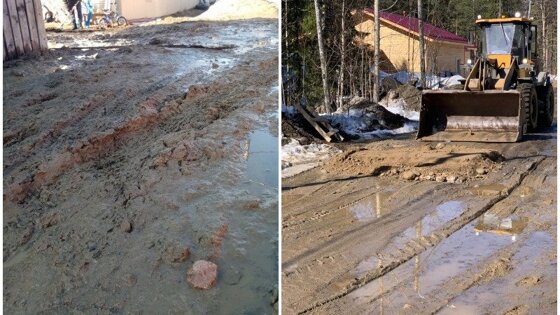 После оттепели костомукшский двор, в котором зимой велись земляные работы, стал непроходим. Местные жители рассказали: просто выйти из дома – уже проблема, машины с трудом могут проехать по дороге, которая больше подходит для проведения гонок по бездорожью. 18 апреля паблик «Беседка в Костомукше товарной» опубликовал фотографии размытого грунта и сообщил, что проблема никак не решается. Нас просили потерпеть и даже показывали гарантийное письмо, что асфальт нам вернут. Летом. Пришла весна. Замерзший грунт в декабре лег, как придется. А теперь мы не можем подойти к дому. Машины не припарковать, через текущую жижу не перескочить. Так и месим глину и надеемся, что наши обращения окажутся услышаны до прихода следующего декабря. Запросы были посланы в администрацию, но ответа и действий пока не последовало. Портал «Карелия.Ньюс» обратился за разъяснениями в городскую администрацию. Понятно, что в зимнее время грунт плохо затрамбовался, а сейчас в весенний период началось активное снеготаяние, естественно грунт увлажнен и все это превращается в кашу. Мы каждый день ездим туда, контролируем ситуацию. Исполнитель работ привез машинущебня песчано-гравийной смеси, будет работать техника. Сделали деревянные настилы к зданию суда, оградили лентой сигнальной место работ. Действительно сейчас не очень хорошая проходимость, но какой-то критической ситуации нет. Исполнитель работ обещает решить вопрос в ближайшие пару дней, – отметила в разговоре с нашим корреспондентом начальник управления городского хозяйства Любовь Железняк. Она добавила, что выложенные в паблике фото – старые. Уже в пятницу прибыла техника, сейчас участок выглядит иначе. Любовь Железняк добавила, что лично побывала на объекте и заверила – сотрудники мэрии контролируют ход работ. В доказательство своих слов чиновница отправила более свежие снимки – на них действительно видно, что техника работает. Напомним, в декабре в одном из костомукшских дворов появился огромный котлован. Горожане рассказали, что их не предупредили о работах и на участке нет никаких заграждений. В мэрии ответили на претензии горожан и пообещали, что работы не будут приняты, пока подрядчик не восстановит асфальт до исходного состояния.