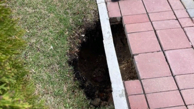 Рядом со зданием областной думы и памятником Петру Столыпину провалилась плитка, а над ямой будто по волшебству осталась висеть часть бордюра.