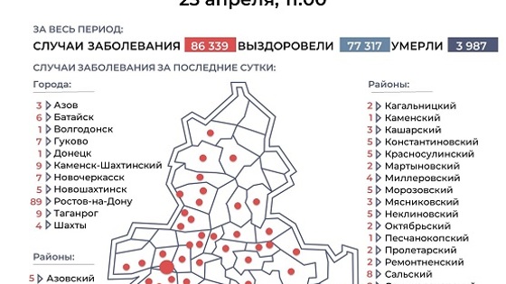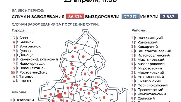 Ростовская область, 23 апреля 2021. DON24.RU. За сутки в 41 территории Ростовской области выявлено 238 новых заболевших коронавирусом, информирует портал донского правительства. Тройку городов с наибольшим числом заболевших за сутки составили Ростов (89 случаев), Каменск-Шахтинский и Таганрог — по девять, столько же — в Тарасовском районе. Напомним, вчера в Каменске зарегистрировали четверых заболевших, а в Таганроге — троих. В остальных муниципалитетах зафиксировано от одного до восьми случаев заражения. Также за истекшие 24 часа от новой болезни выздоровел 201 человек. Врачи констатировали смерть от коронавируса еще 15 пациентов. Это семь женщин возрастом 62-84 лет и восемь мужчин (от 58 лет до 81 года). Сейчас в ковидных госпиталях лечатся 1966 пациентов. Из них к аппаратам ИВЛ подключено 188 человек. По данным регионального оперштаба, за весь период борьбы с инфекцией на Дону заболели 86 339 человек, выздоровели 77 317 человек. Жертвами болезни стали 3987 человек. Сообщается, что вакцину от коронавируса сделали уже почти 276 тысяч жителей Ростовской области.