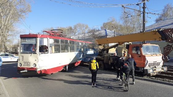 В Челябинске трамвай сошел с рельсов после столкновения с автокраном