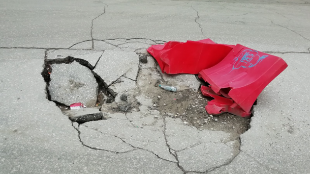 «Образовавшийся ещё осенью 2020 года провал посередине дороги постепенно расширяется, установленные пластиковые блоки периодически тоидело сбивают. Дорожным службам пора обратить наэто внимание»,— написал Сергей Живолупов.