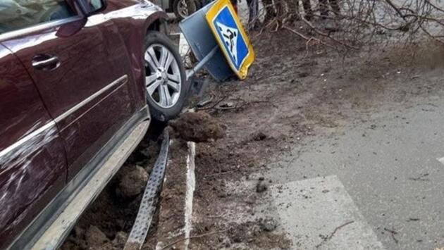 ДТП произошло на перекрёстке улиц Анохина - Полины Осипенко. Автомобиль врезался в стоящее рядом с пешеходным переходом дерево и снёс дорожный знак.