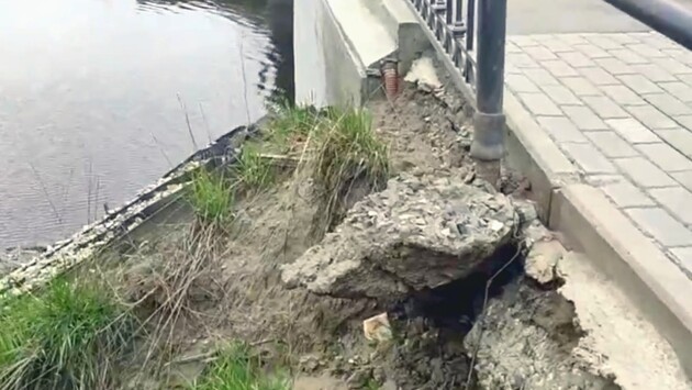 «Вчера на мосту произошел обвал. Плитку на тротуаре покорбило, и часть ее просела вместе с грунтом. Между поребриком и плиткой образовалась значительная щель, в которую легко может провалиться нога. Вода, стекающая с моста после дождей, с каждой минутой все сильнее размывает обвал. »