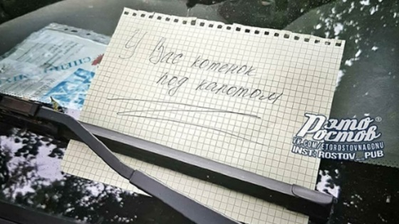 Ростовская область, 11 мая 2021. DON24.RU. Записка на лобовом стекле автомобиля вызвала одобрение ростовчан. Фото тетрадного листа, на котором написано «У вас котенок под капотом» появилось в паблике «Это Ростов» с подписью «Забота по-ростовски». За два часа пост собрал почти 200 отметок «нравится». Однако некоторые горожане решили, что подобные предупреждения — лишнее. Так Елена Премудрая написала: «Совсем тупые? Коты при звуках открытия двери не парятся. У них инстинкт самосохранения круче чем у нас». Но Татьяна Гетц с ней не согласилась: «Я так собакена вызволила недавно. Водитель уже собирался отъезжать, а песель обезвоженный был, силушек встать не было, видимо. Напился водицы и ушел досыпать куда-то». Напомним, ростовчан возмутили новые раздевалки на пляже Зеленого острова.