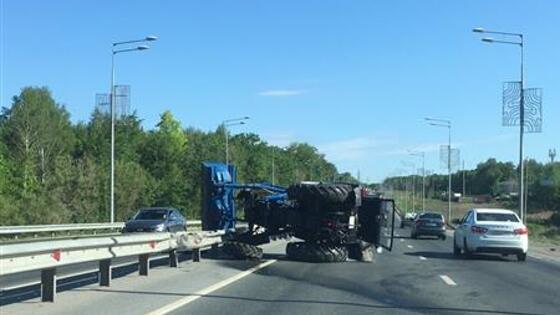 В Самаре на Волжском шоссе образовался затор из-за перевернувшегося трактора