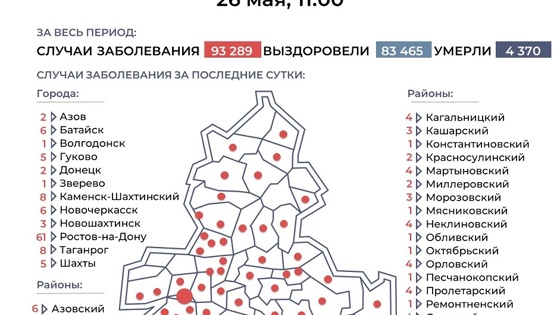 Ростовская область, 26 мая 2021. DON24.RU. Региональный оперштаб обнародовал свежие данные по распространению коронавируса в городах и районах Ростовской области. Новые носители инфекции выявлены в 47 муниципалитетах. Среди территорий с максимальным приростом заболевших - Ростов (61 случай), Каменск-Шахтинский и Таганрог (8 в каждом). В остальных муниципальных образованиях выявлено от одного до шести новых заболевших. При этом на Дону за сутки диагноз коронавирус подтвердился у 185 человек, 14 человек умерли, 164 выздоровели. В стационарах от ковида лечатся 1364 больных. В тяжелом состоянии к аппаратам инвазивной ИВЛ подключены 15 человек, к неинвазивной ИВЛ – 135 человек.