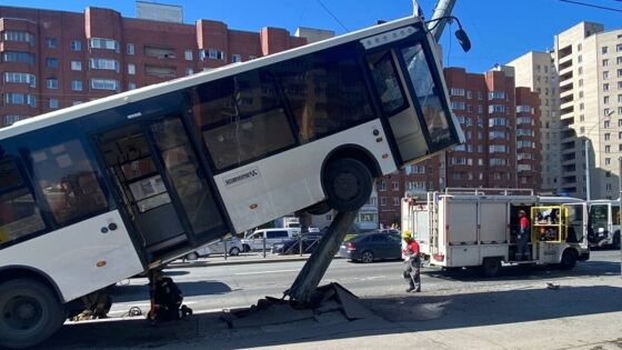 Инцидент произошел на улице Котина. Автобус влетел в столб и повис на нем. По предварительным данным, водитель мог не справиться с управлением транспортного средства. На месте происшествия работают полицейские и сотрудники экстренных служб.