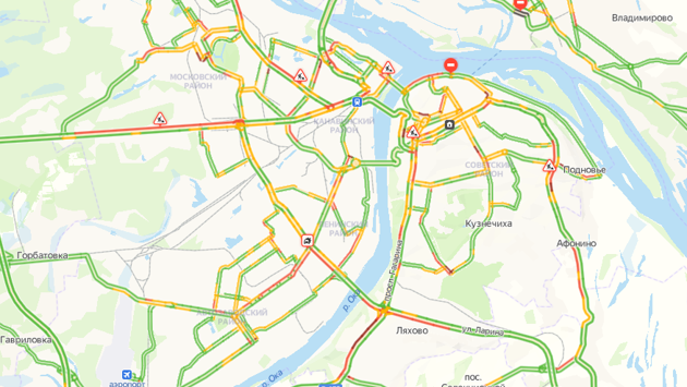 Традиционные пятничные пробки образовались на основных магистралях Нижнего Новгорода, согласно данным сервиса «Яндекс пробки».