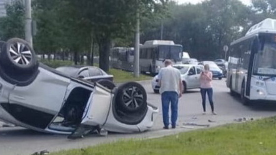 После того, как произошло столкновение, легковой автомобиль наезжает на бордюр и переворачивается.
