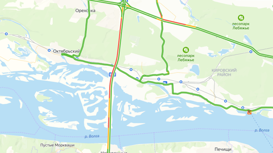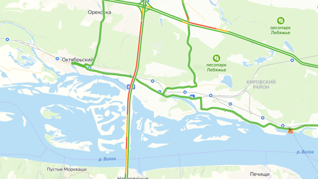 Судя по карте, движение затруднено на участке по улице Залесной и по трассе М-7 в сторону Иннополиса.