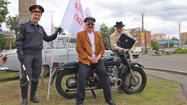К железнодорожному переезду «киноводители» прибыли на знаменитых ретро-автомобилях – «Волгах» ГАЗ-21 и патрульном мотоцикле «Урал».