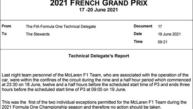 В ночь с пятницы на субботу команда McLaren нарушила правило комендантского часа, запрещающее сотрудникам, непосредственно связанным с обслуживанием машины, находиться на трассе в период с 23:30 до 9:00 по местному времени. Это первое из двух допустимых нарушений за сезон, никаких санкций не последует.