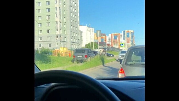 Запись сделана на Окском проезде. Видно, как машина движется в сторону улицы Есенина по пешеходной дорожке вдоль встречной полосы.