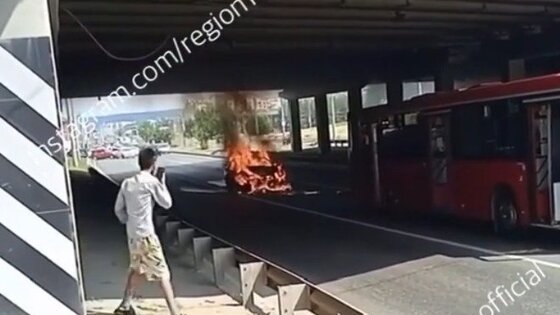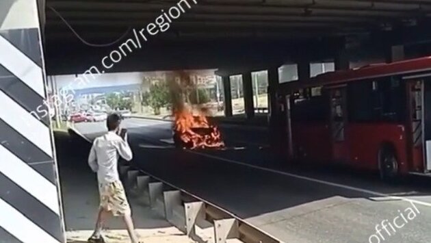 Автор ролика пишет, что автомобиль перед возгоранием врезался в автобус. Предварительно, водитель легковушки был нетрезв.
