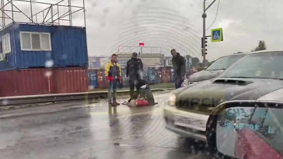Пешеход лежит на переходе, рядом с ним находится сотрудники Росгвардии и ДПС.