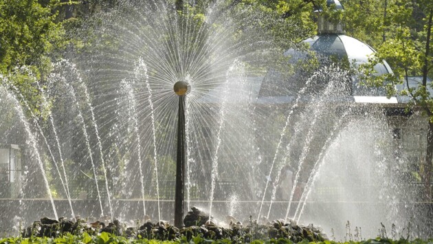 После сезонного перерыва в Нижнем саду снова «засияло солнце». Фонтан «Солнце» – уникальный механизм 1724 года. Колесо наверху приводится в движение под напором воды, далее – при помощи зубчатой передачи начинает вращаться и колонна с золочеными дисками.