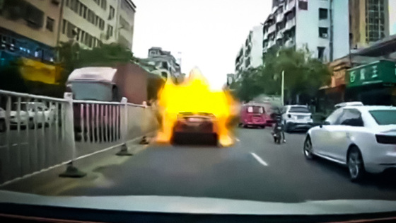 В Сети появилось видео, на котором седан Toyota Camry внезапно взрывается во время езды по оживленной улице в Китае. Как видно на ролике, первый взрыв оказался не единственным и, судя по всему, не самым мощным: объятый пламенем седан через некоторое время взорвался еще раз, причем над ним даже поднялось грибовидное облако из огня и дыма. Затем уже выгоревший остов автомобиля вспыхнул в последний раз.