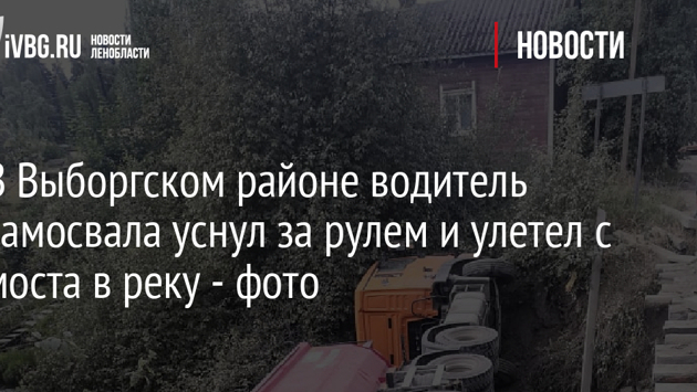 Сейчас дорожники пытаются поднять самосвал из реки. Работы осложняются тем, что большегруз лежит на боку. Как сообщает пресс-служба дорожного комитета Ленобласти, в ночь на 23 июля водитель самосвала MAN уснул за рулем, снес ограждение на мосту через реку Михалевка в Выборгском районе Ленобласти и улетел в водоем. Фото: Дорожный комитет Ленобласти До этого он проигнорировал дорожный знак об ограничении веса в 13 тонн на мосту. Также при падении самосвал повредил часть настила переправы. Водитель не пострадал. Также этой ночью в поселке Кузнечное BMW вылетел с моста на железную дорогу.