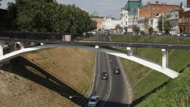 Пешеходный мост через Зеленский съезд, отремонтированный в ходе реставрации Нижегородского кремля, оснащен архитектурной подсветкой. Об этом сообщили в управлении делами регионального правительства.