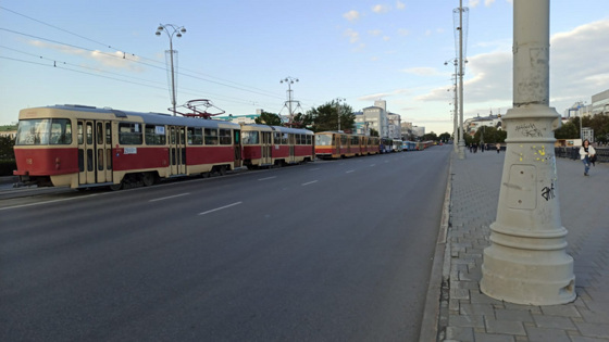 В Екатеринбурге парализовано движение трамваев по проспекту Ленина. Пробка растянулась от Театра музыкальной комедии до плотины реки Исеть. Об этом сообщил корреспондент URA.RU с места событий.