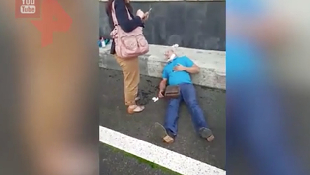 На кадрах видно, как в результате дорожного происшествия образовалась большая пробка. На обочине находятся пострадавшие люди: лежит мужчина и женщина с перевязанной окровавленной головой.