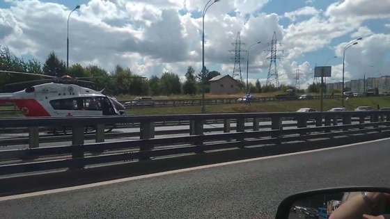 Как видно из видео с места происшествия, медикам удалось приземлиться на шоссе в нескольких десятках метров от места ДТП. В самом месте аварии сосредоточены многочисленные кареты бригад скорой помощи. Движущиеся мимо них автомобили объезжают образовавшееся препятствие по крайней правой полосе, для этого дорога специально частично перекрыта.
