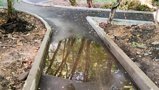 «Десятилетиями после дождей разливалась обширная и глубокая лужа, а вокруг нее грязь и бездорожье. Недавно "Жилищник" решил там сделать ремонт. Положили новый асфальт, огородив его высоченными дорожными бортами. И вот историческая лужа снова с нами — как новенькая! Теперь стало значительно комфортней ее огибать: не по грязи, как раньше, а по высоким бортам, не замочив ног. Очень удобно!» — пишет автор поста.