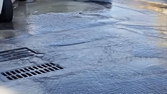 Накадрах видно, как вода течет подороге напротив магазина спорттоваров, амашины объезжают «фонтан», заезжая навстречную полосу. Автор видео уточнил, что место происшествия находится недалеко отзаправки.
