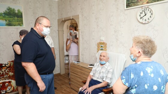 В ходе рабочей поездки в Кузнецк врио губернатора Пензенской области посетил 102-летнего участника Великой Отечественной войны Александра Казимирова. Ветеран поделился с Олегом Мельниченко фактами своей легендарной жизни. В июне 1941 года он был призван на войну. Направлен на границу с Финляндией, служил связистом. После снятия блокады Ленинграда в составе 122 Стрелковой Дивизии участвовал в освобождении Венгрии, Румынии. День Победы встретил в Австрии. В свою очередь, врио главы региона уточнил самочувствие старейшего жителя города и поинтересовался, видны ли изменения в работе водопровода. Александр Степанович подчеркнул, что в последнее время качество воды, доставляемой по водопроводу в их квартиру, существенно улучшилось. «Вода хорошая стала, а то желтая была. Сейчас – нормальная», — сказал ветеран. Напомним, что в июле этого года в Кузнецке была введена в эксплуатацию вторая станция обезжелезивания, благодаря чему обеспечены чистой водой более 35 тысяч потребителей. Фотография: pnzreg.ru