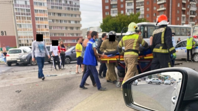 Судя по появившимся кадрам с места ДТП, в аварии пострадали люди, сейчас на месте работают скорая помощь и сотрудники полиции.