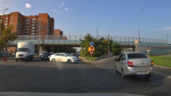 Владельцу регистратора пришлось сбросить скорость, уходя от столкновения. Рисковал попасть в ДТП и автомобилист, управлявший «Ладой-Грантой» и в тот момент заезжавший на путепровод. Он резко затормозил. Аварии удалось избежать.