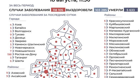 Ростовская область, 18 августа 2021. DON24.RU В 55 городах и районах Ростовской области за сутки выявили новые случаи заражения коронавирусом. Об этом сообщает региональный оперштаб. По суточному приросту зараженных в лидерах оказался Ростов - 198 человек, второе место разделили Гуково, Азовский, Аксайский, Каменский и Сальский районы - по 9 человек, на третьем месте Неклиновский и Цимлянский районы - по 8 человек. В остальных муниципалитетах региона за сутки выявили от 1 до 7 новых случаев заражения коронавирусом. Показатель заболевших на 100 тыс. населения составил 2 811 человек, коэффициент распространения инфекции - 1. За сутки в Ростовской области выявили 458 новых случаев заражения ковидом. Количество выздоровевших за тот же период насчитывает 379 человек. Ранее стало известно, что среди привитых от коронавируса россиян осенью разыграют по 100 тысяч рублей.