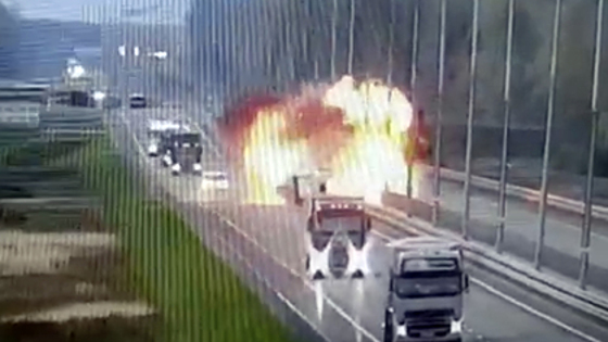 На кадрах видно, как водитель фуры потерял управление, большегруз съехал к отбойнику, врезается в него, а затем произошел взрыв.