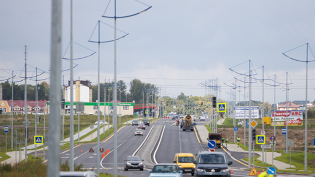 На Калининградском шоссе построили три круговых пересечения. Заканчивается новая магистраль у центрального парка. Дальше, в сторону Полесска, идёт дорога в две полосы.