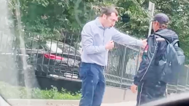 На кадрах видно, как в ходе словесного конфликта водитель начинает трясти инспектора и затем бьет его по кепке.
